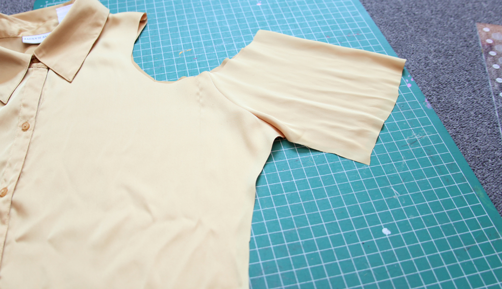 This is what my gold shirt looked like after I removed the length and the sleeves. From here I used white chalk to draw the shoulder cut outs. You can't see them in the photo since they're so light, but this part it fairly important. It will help you make even shoulders. On this particular blouse, I cut out past the shoulder break, creating an off-the-shoulder look. On the striped blouse I stayed between the collar and the shoulder to keep it more of a peek-a-boo type cut.
